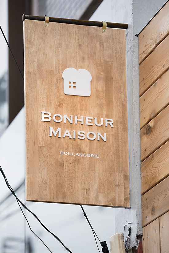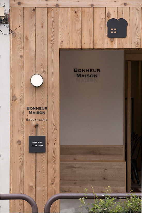 ファサードはレッドシダーの板貼りで覆い、車で通る方の目にも止まるように訴求効果を高めています。また、外から見たときに、木板張り・パンの陳列・インテリア・厨房へと、 レイヤーを重ねて内部を覗けるような構成とし、店舗への引き込みを作りました。