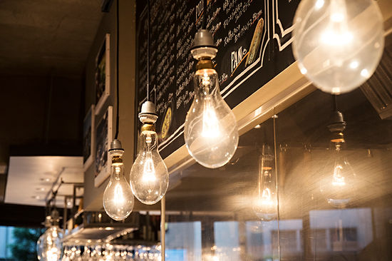 魚介メインのイタリアンバル。モルタル金ゴテ仕上げ、ラワン合板、黒皮鉄など武骨な印象を与える素材を用いることで、質の良いカジュアル感をつくり、そこにアイキャッチとなる漁船ランプを加えることで、漁港・市場など「新鮮な海の魚」を感じさせる空間を考えた。